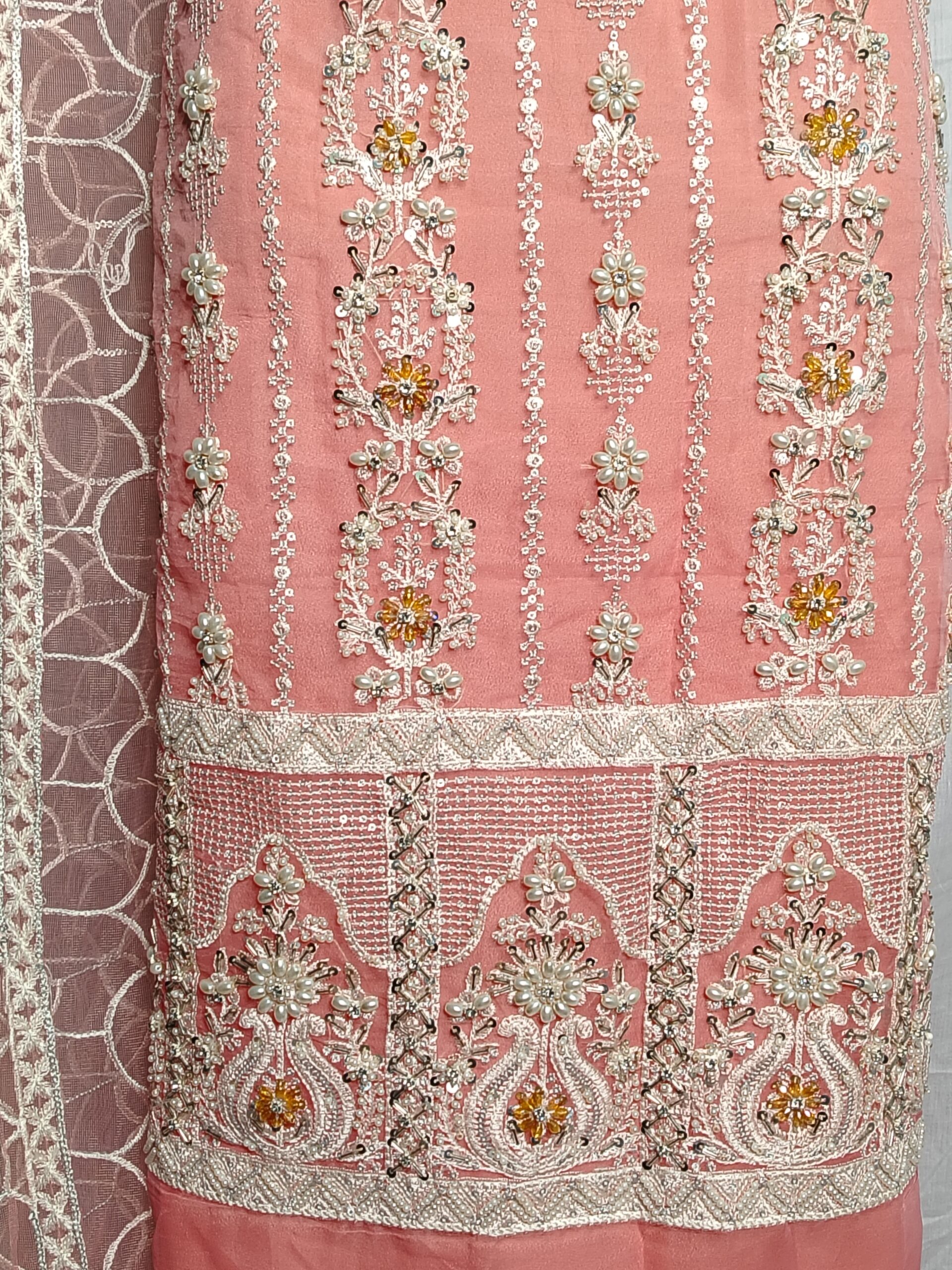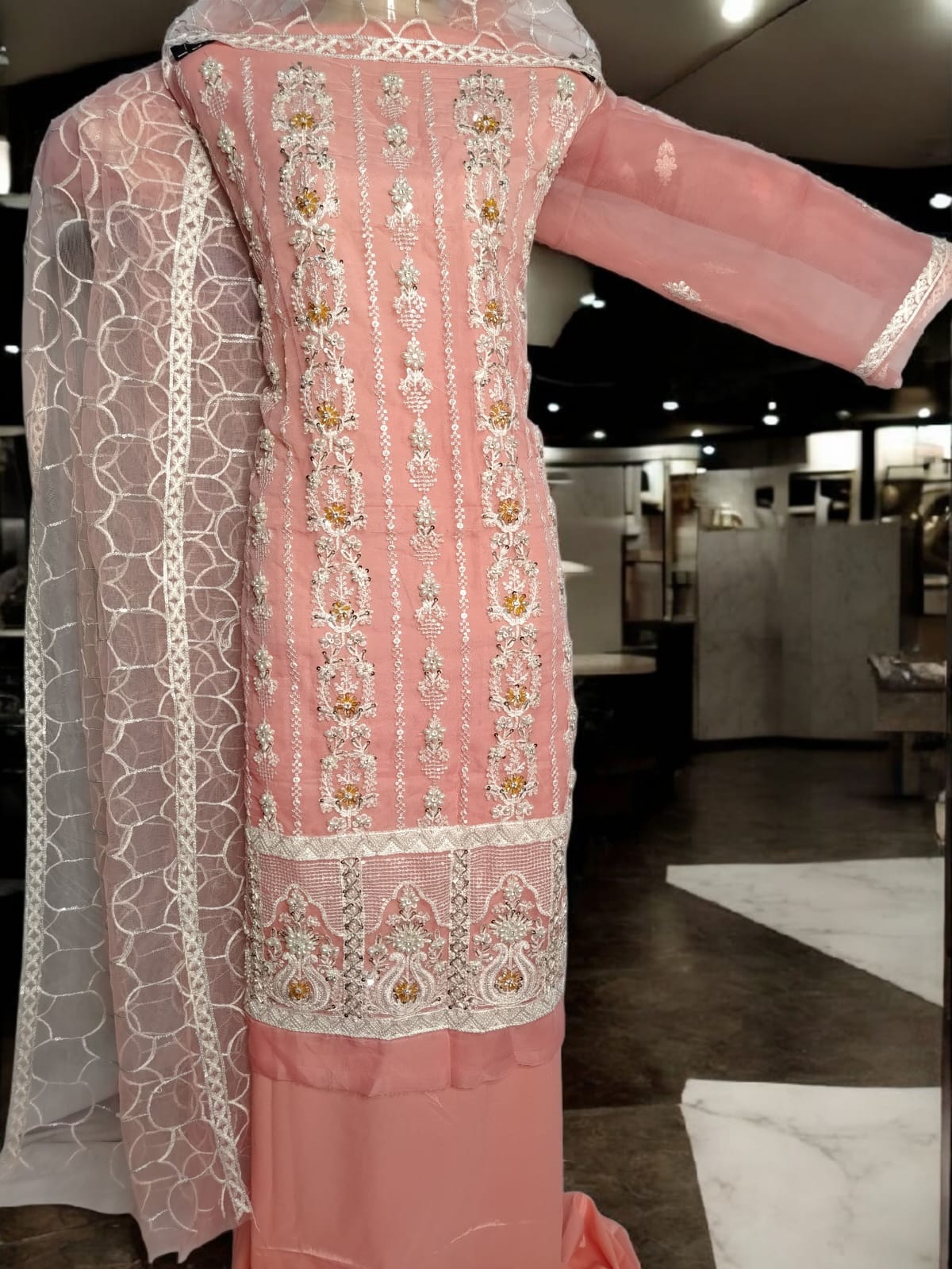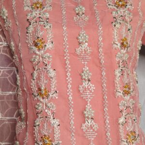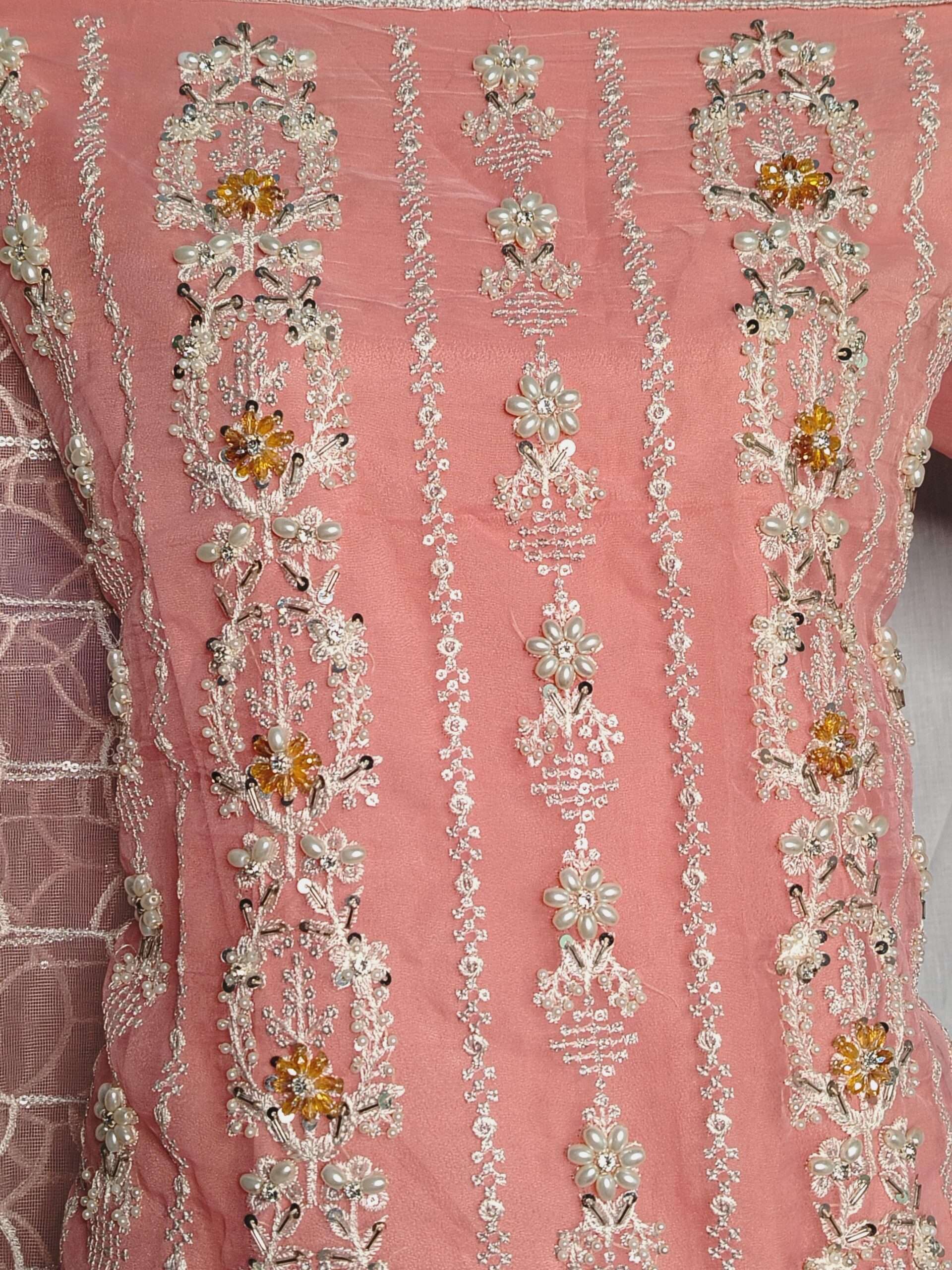 Shirt: Heavily Embroidered (adda work) with Zari, Resham, sequence, Pearls, Stones, Beads, and Reels work.
